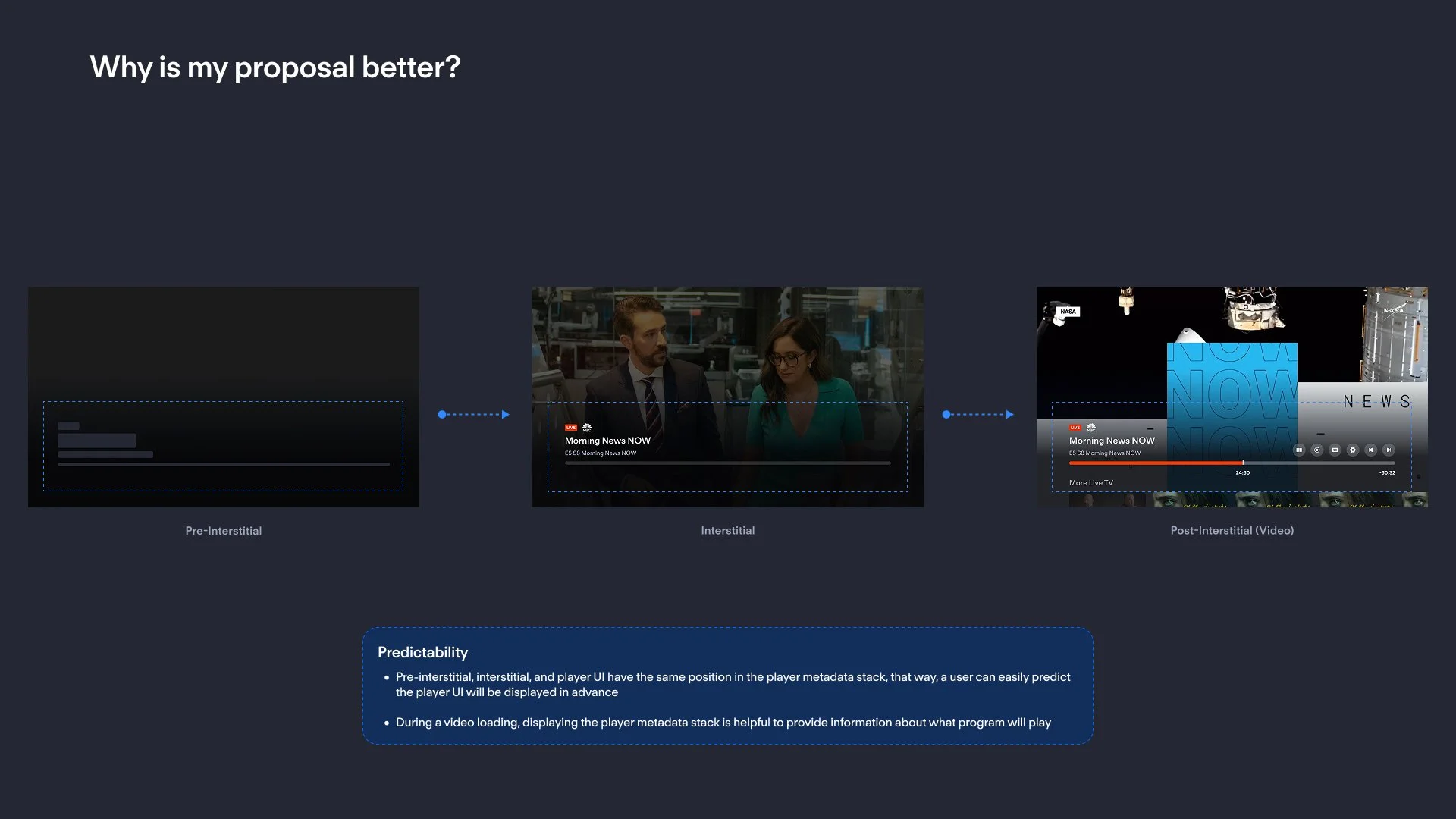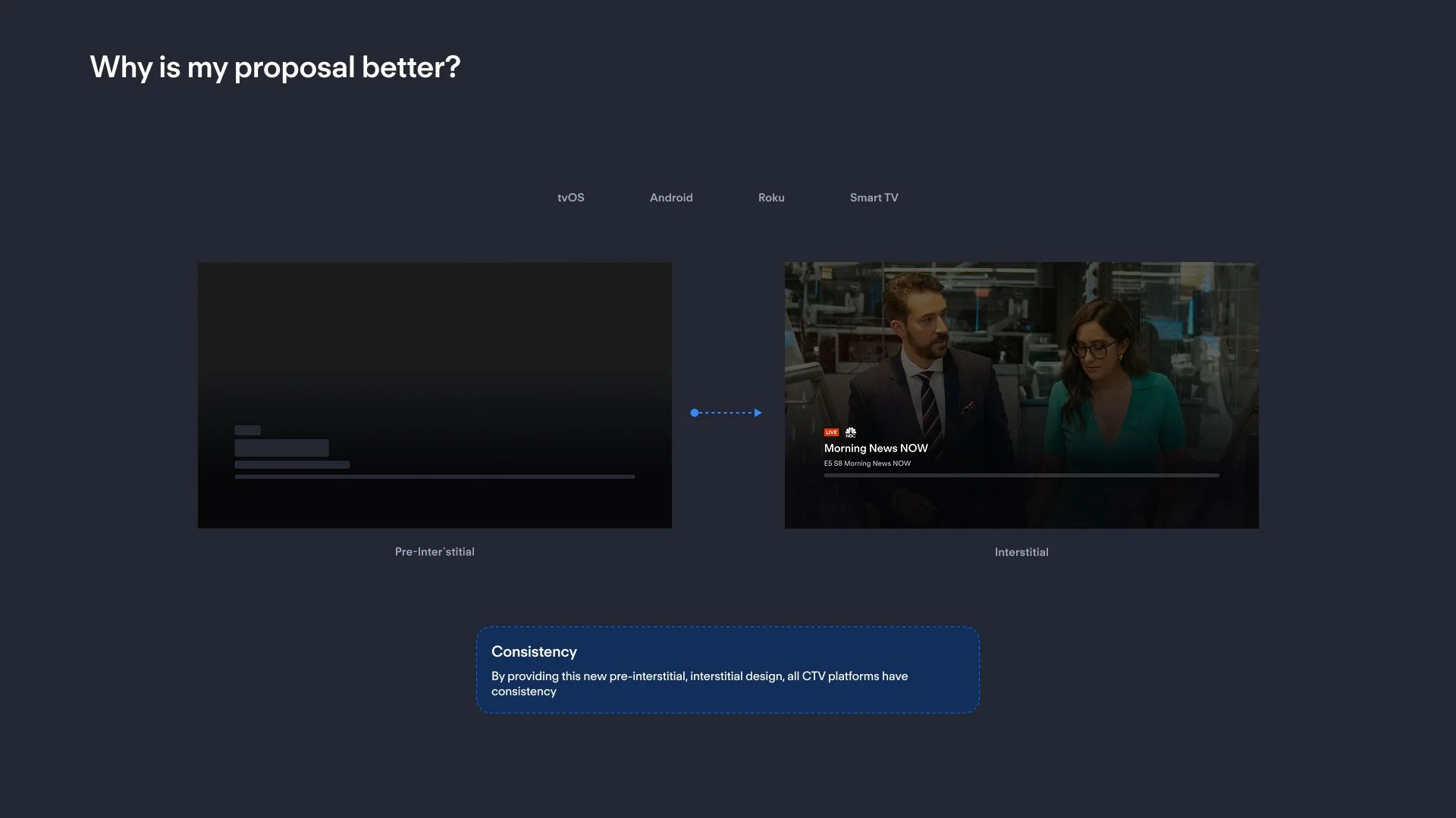 Each CTV platform had its own version of the interstitial screen because it was not documented, which led to inconsistencies across platforms. This project aims to reduce those discrepancies and standardize the interstitial experience across all CTV platforms.