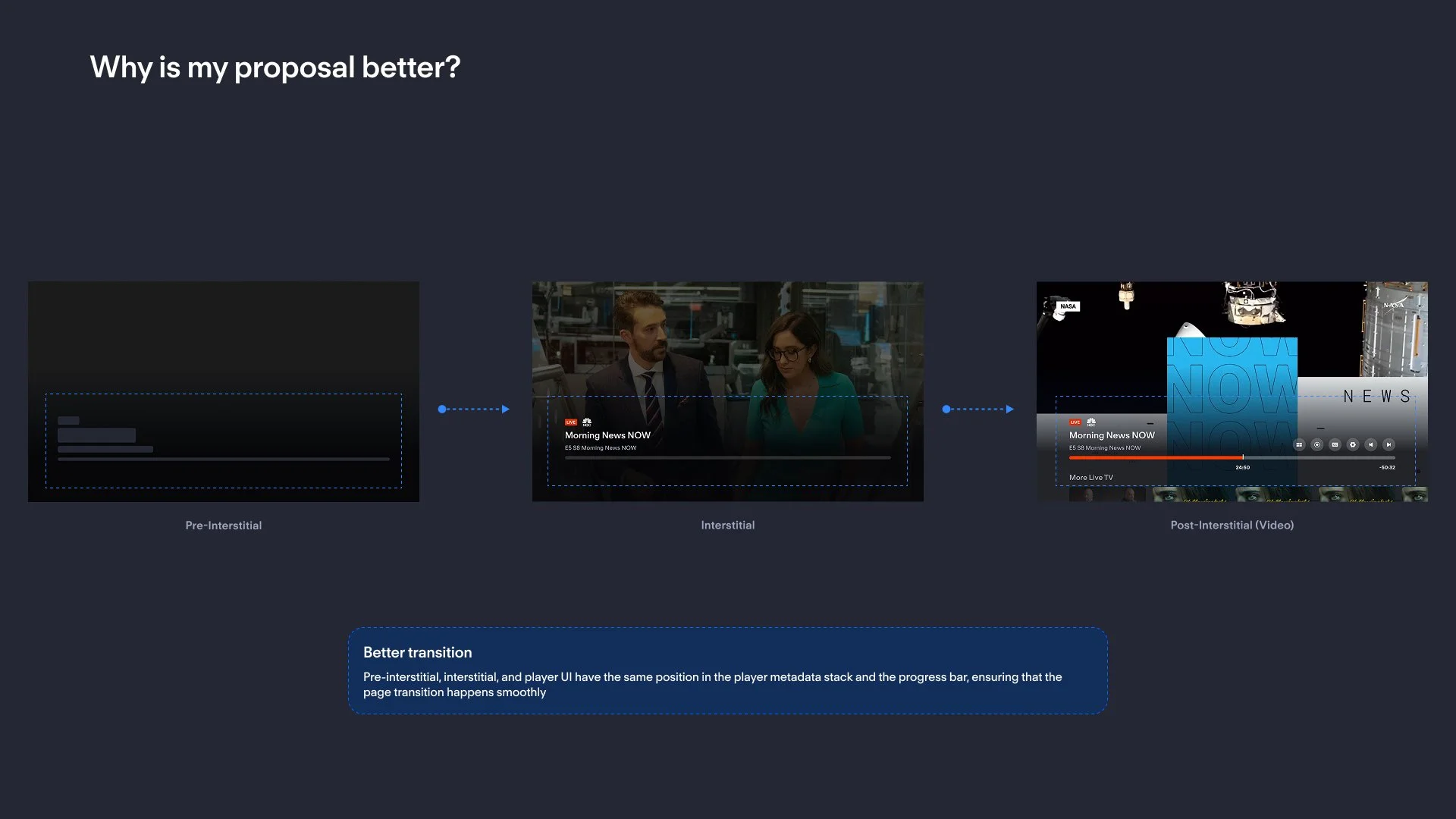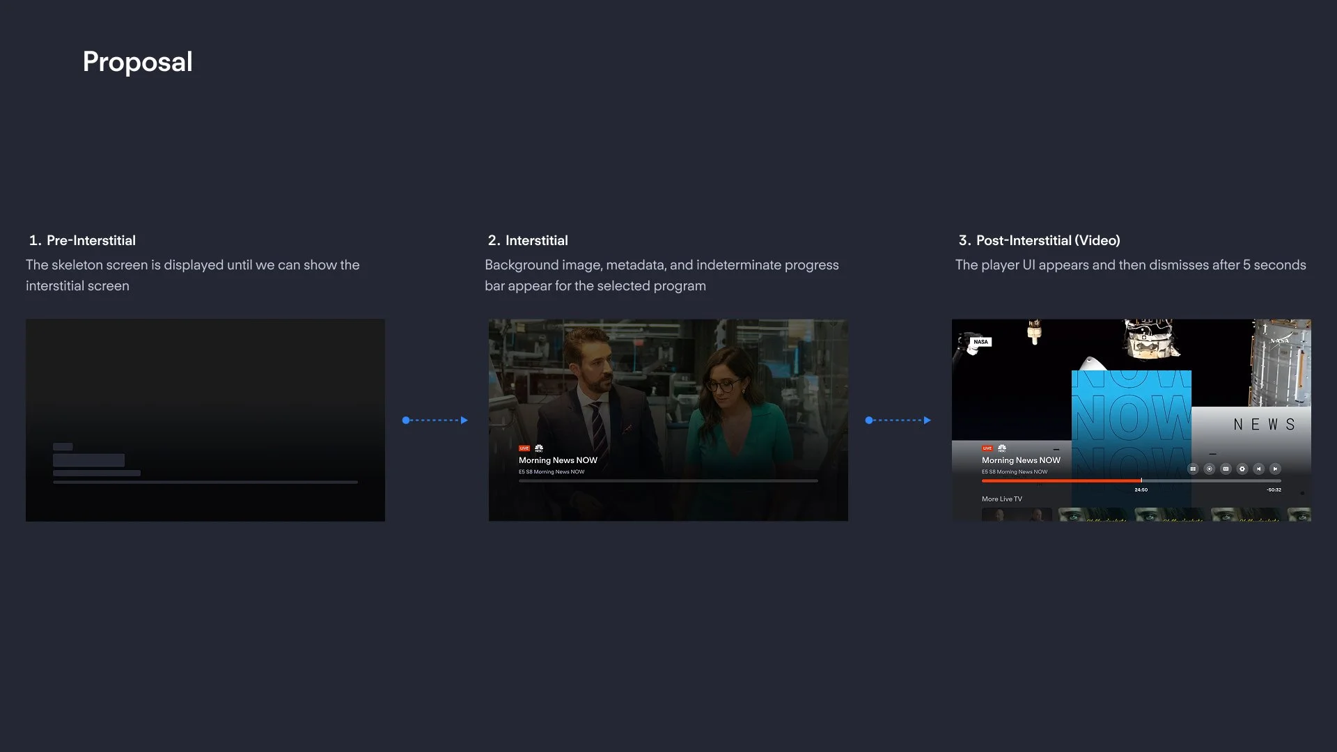 Restructured the interstitial screen flow so that the video player UI appears immediately after the interstitial screen, which significantly increased adoption of the Alternative Broadcast feature on the Smart TV platform where the new design was first launched. Smart TV usage on this platform is roughly 5–10× higher than on other TV platforms